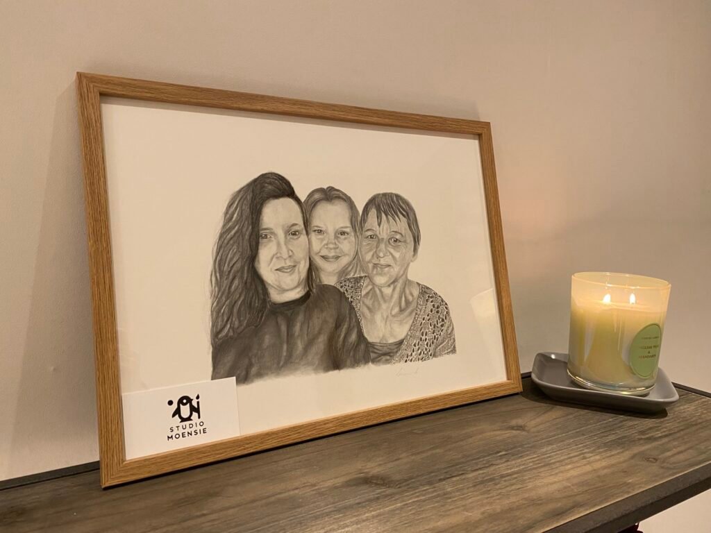Dit portret vertelt zo’n verhaal. Mijn schoonzus was zwanger van haar dochtertje toen haar moeder overleed. Twee levensmomenten die onlosmakelijk met elkaar verbonden zijn, maar nooit samen op beeld vastgelegd konden worden. Dankzij Studio Moensie is dit nu alsnog mogelijk geworden. Op basis van verschillende foto’s – één van mijn schoonzus en haar kindje, en één van haar moeder – heb ik een uniek portret gecreëerd waarin ze toch samen zijn.